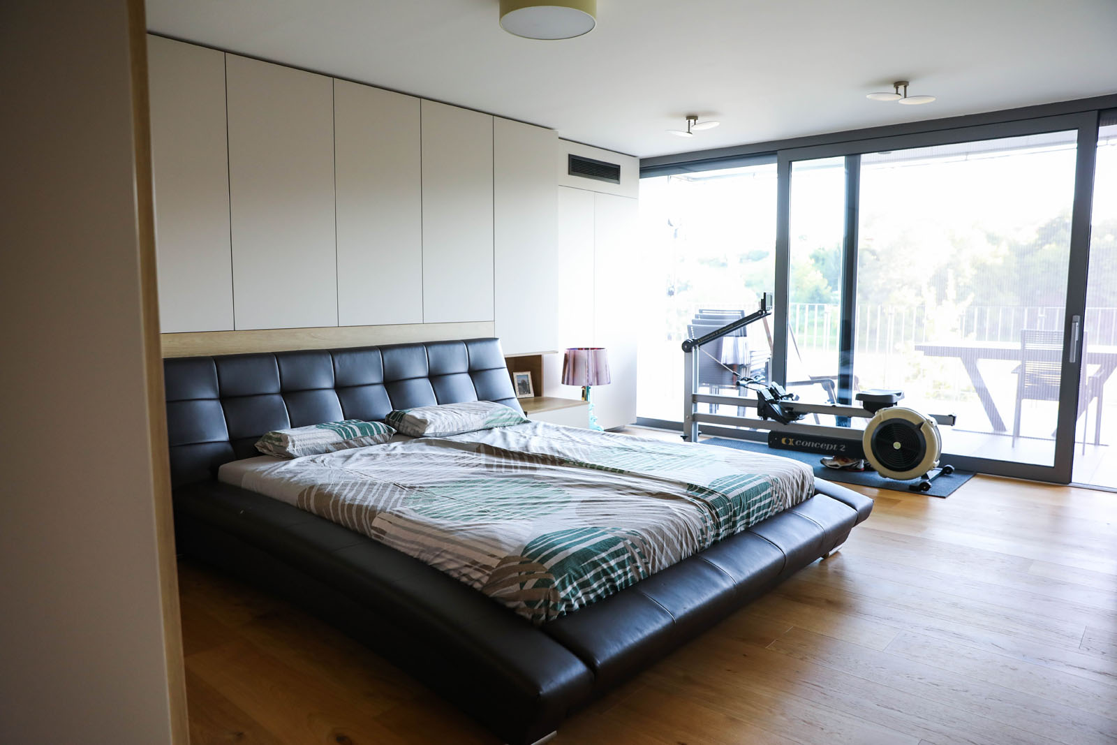 Spalnica je zasnovana z osupljivim razgledom na Dravo in Pohorje. Za posteljo se razprostira celotna stena omar po meri, ki se prepletajo z bež barvo in lesom. Na levi strani spalnice dekorativne letvice ustvarjajo mehke prehode tekstur.