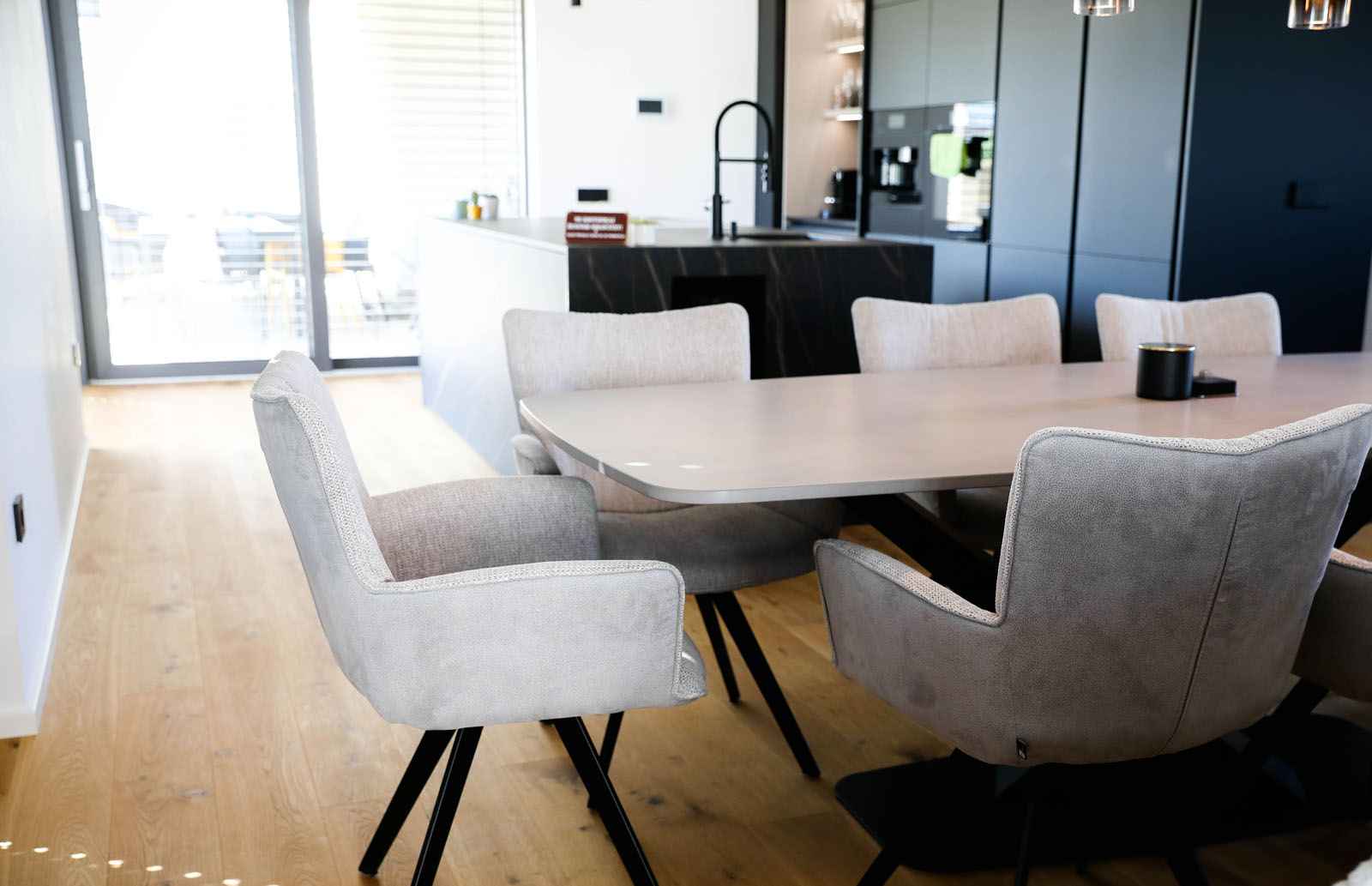 Jedilnica je središče druženja in uživanja ob skupnih trenutkih. Miza iz tehničnega kamna Laminam s kovinskim podnožjem združuje modernost in udobje. Vinska vitrina z LED osvetlitvijo omogoča eleganten prostor za shranjevanje vin in kozarcev, ki so vedno pri roki.