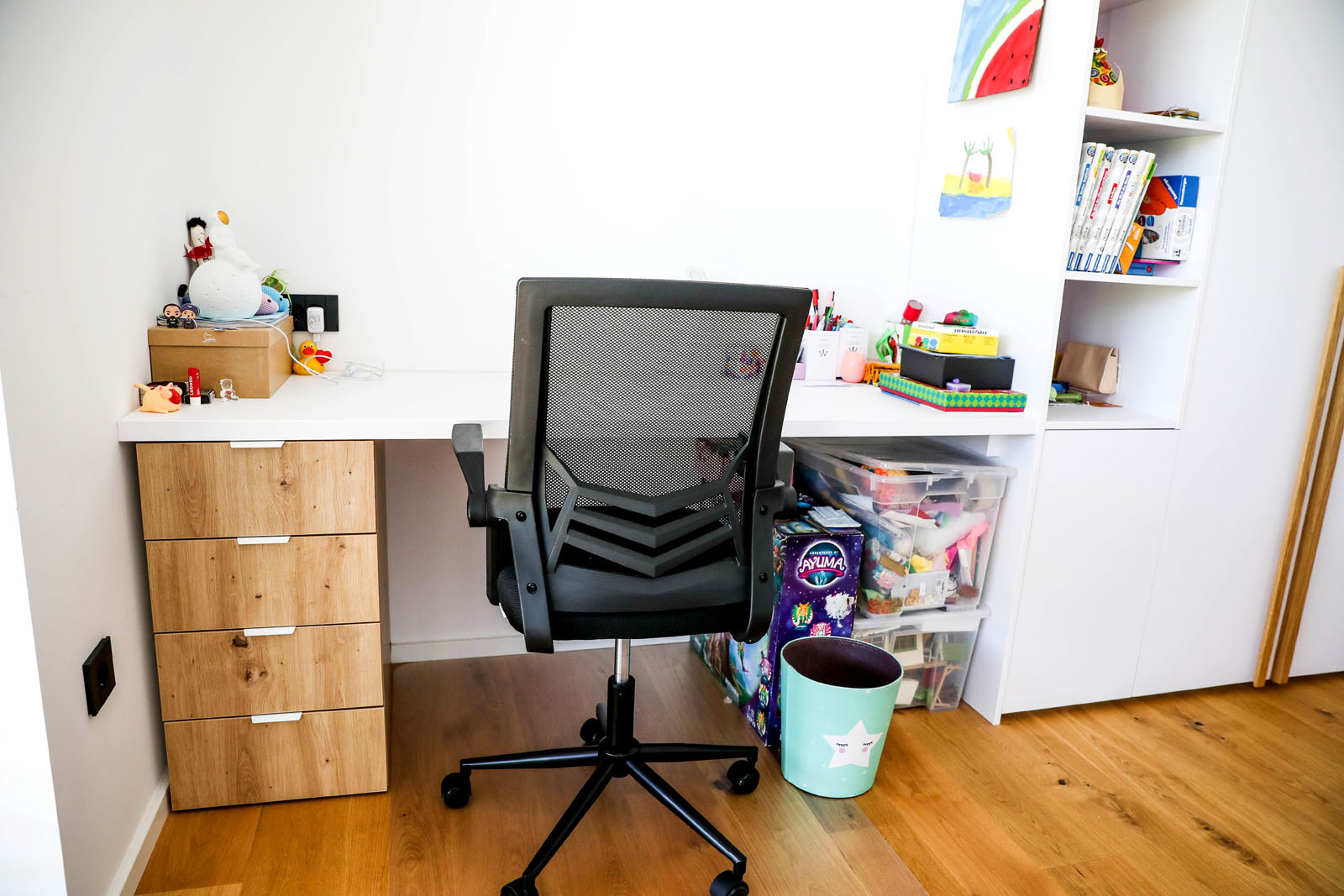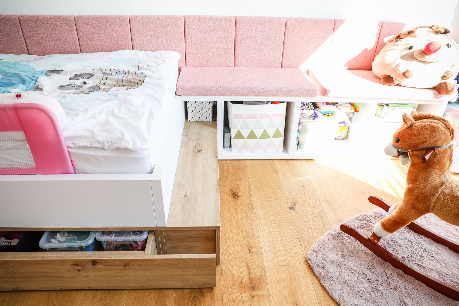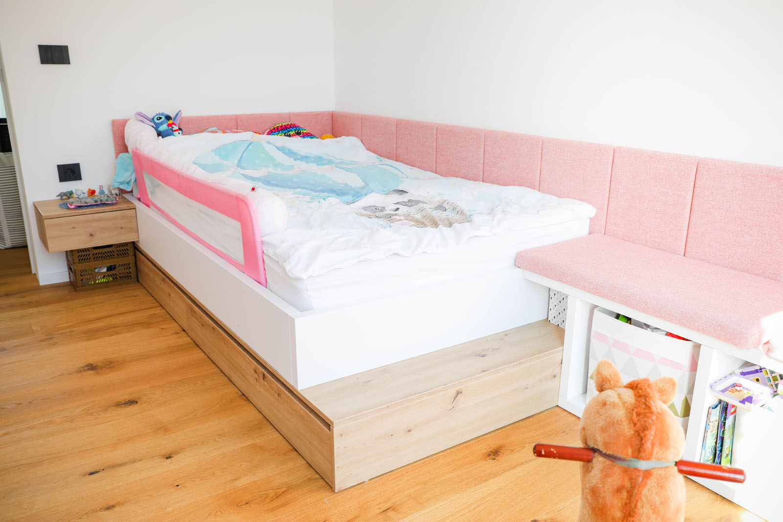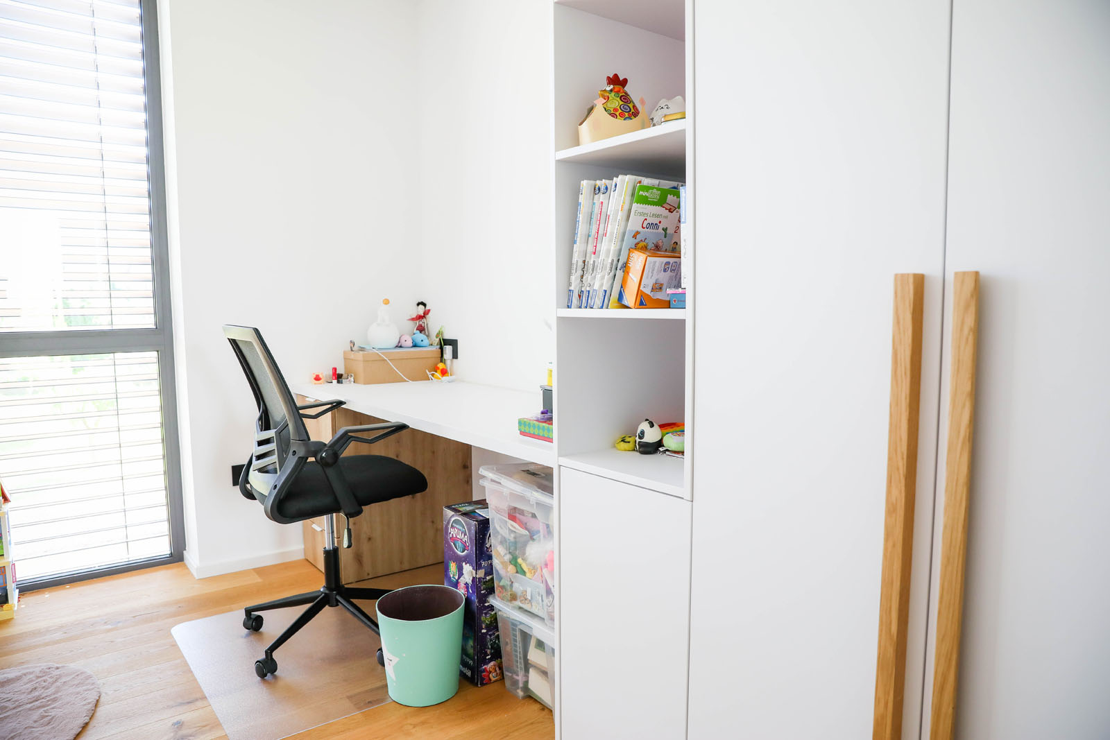 Prva otroška soba ponuja toplo in prijetno okolje za igro in počitek. Roza tapecirano naslonjalo, prostor za sedenje in pohištvo po meri ustvarjajo prostor, ki raste z otrokom in omogoča organizacijo vseh potrebnih stvari.