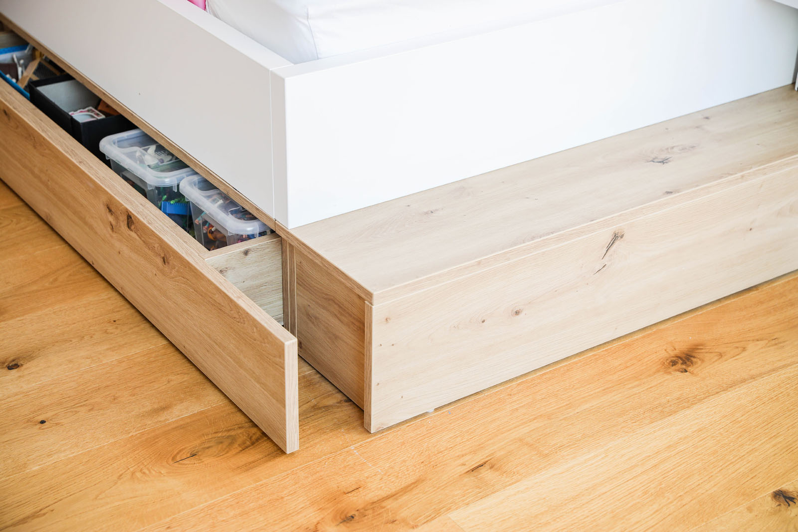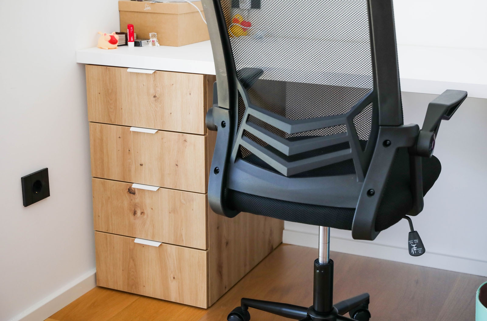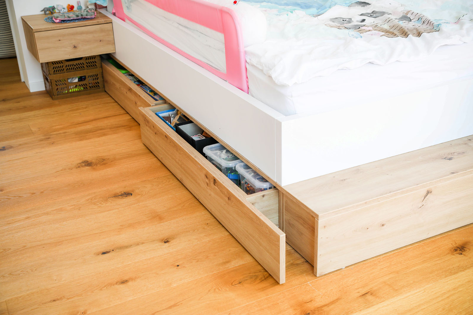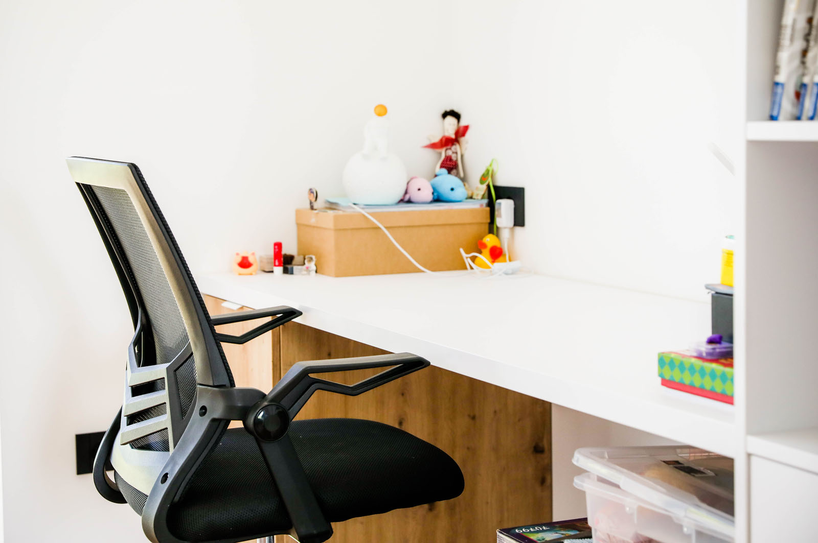 Prva otroška soba ponuja toplo in prijetno okolje za igro in počitek. Roza tapecirano naslonjalo, prostor za sedenje in pohištvo po meri ustvarjajo prostor, ki raste z otrokom in omogoča organizacijo vseh potrebnih stvari.