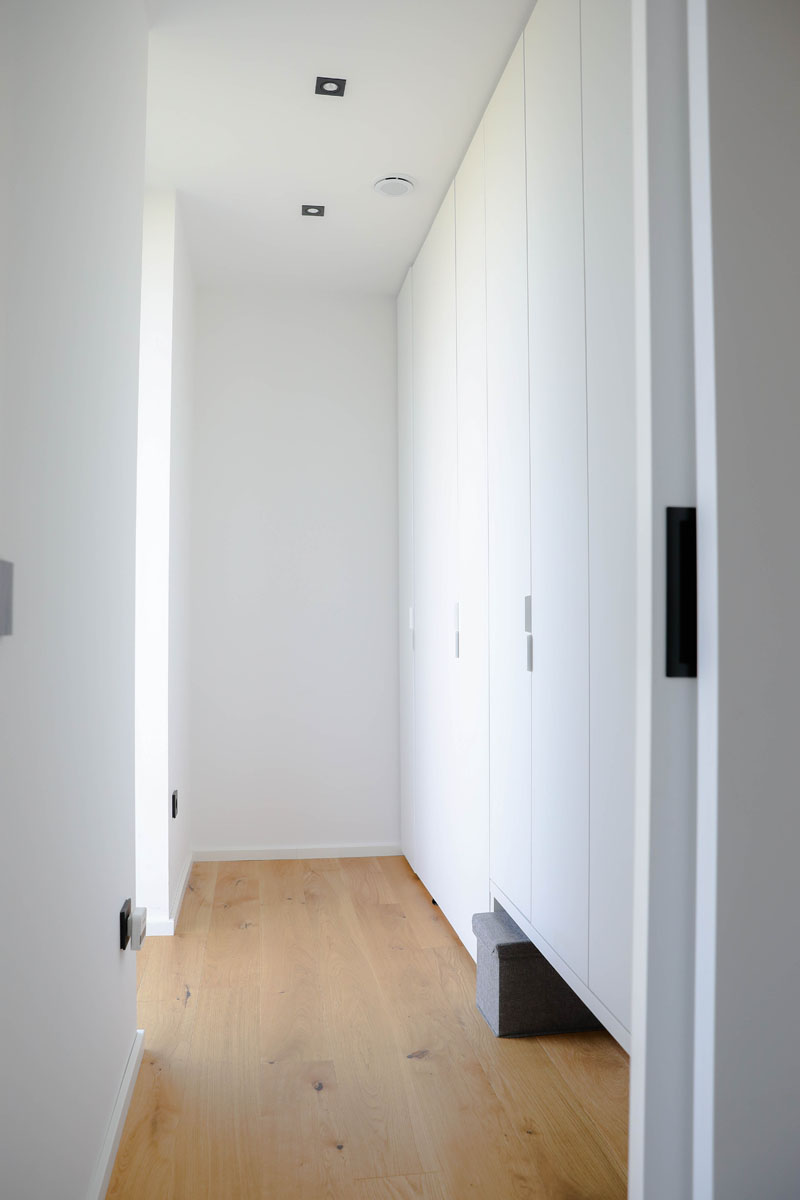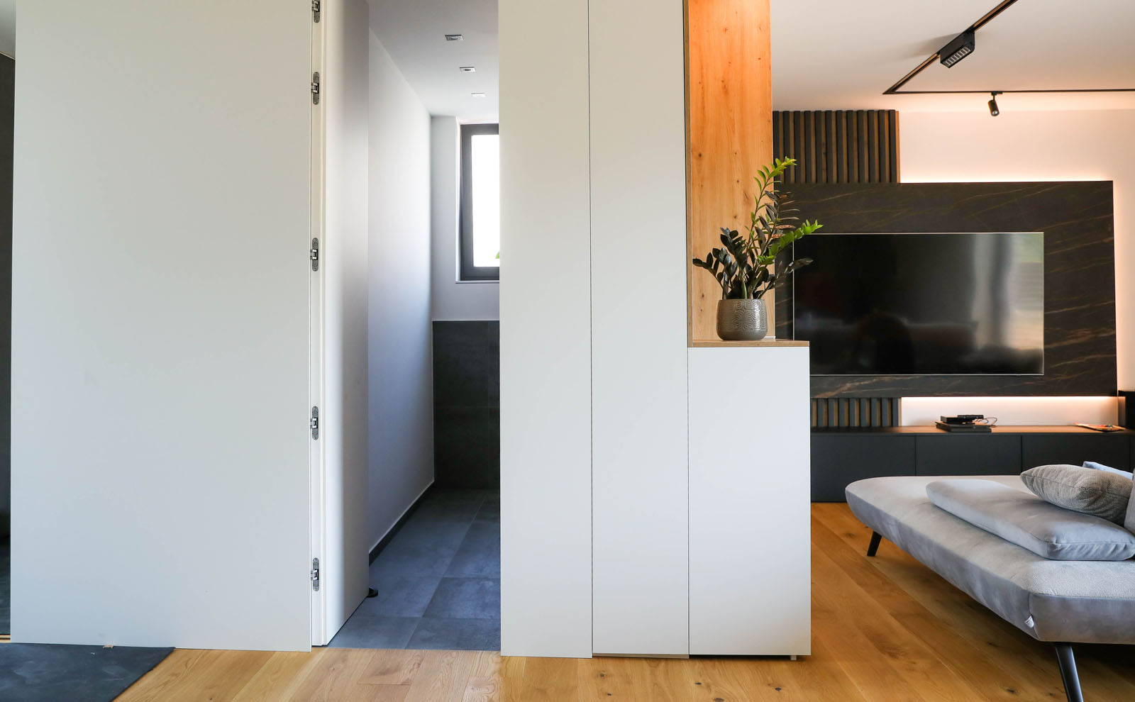 Predsoba projekta Kusna izstopa s svojo prefinjeno belo oblogo, ki skriva potopna drsna vrata z ogledalom. Za vrati se nahaja garderobna soba z belimi optimat omarami in premišljenimi rešitvami za organizacijo čevljev in copatov. Na drugi strani predsobe je WC za goste, medtem ko zaključni del krasi odprta lesena omara z osvetlitvijo, ki prostoru doda toplino.