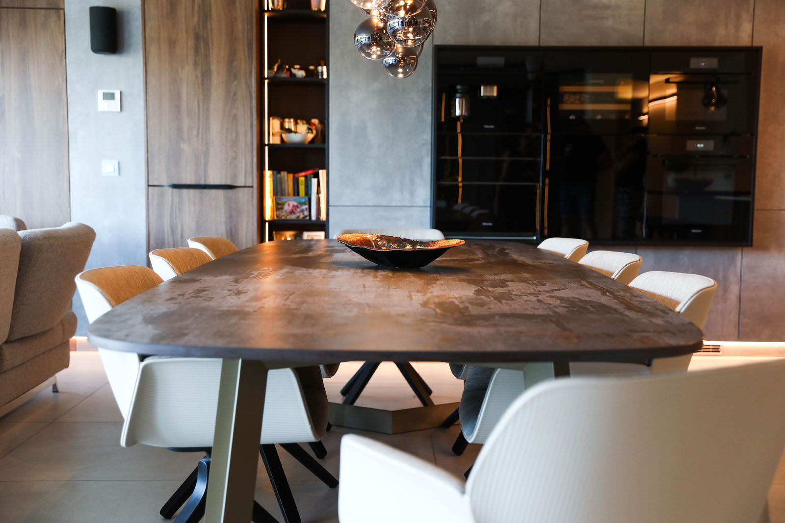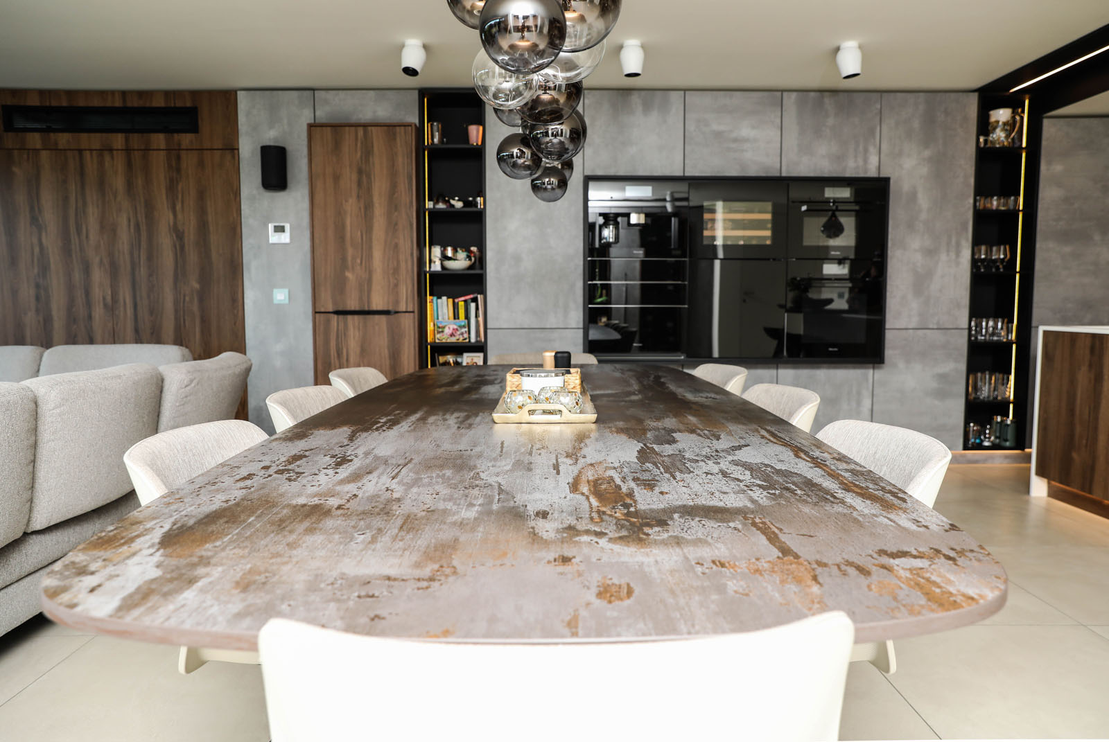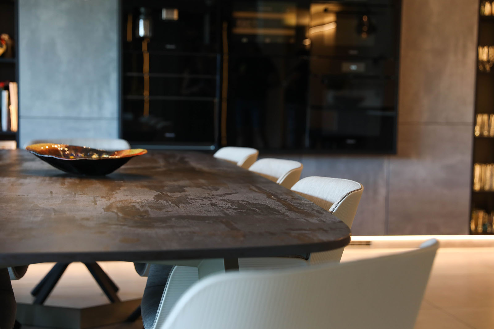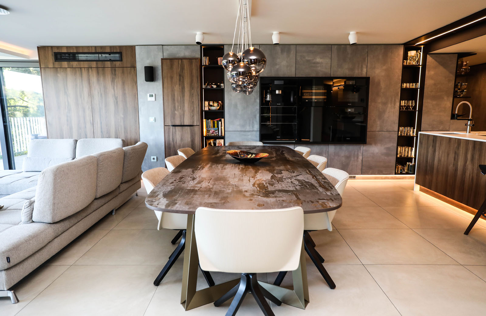Jedilnica očara z mizo po meri, izdelano iz Dektona, s podnožjem iz prašno barvane kovine v zlati barvi. Poleg mize so postavljene vinske vitrine z LED osvetlitvijo, ki elegantno hranijo zbirko vin in kozarcev ter prostoru dodajo pridih razkošja.