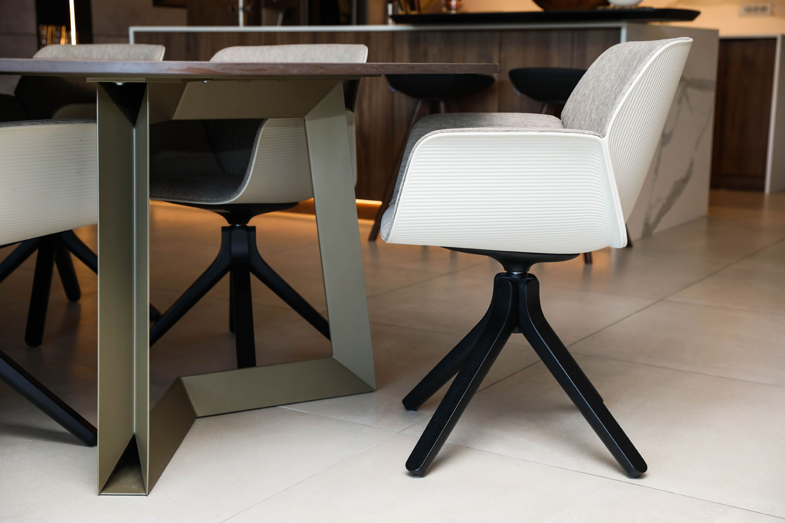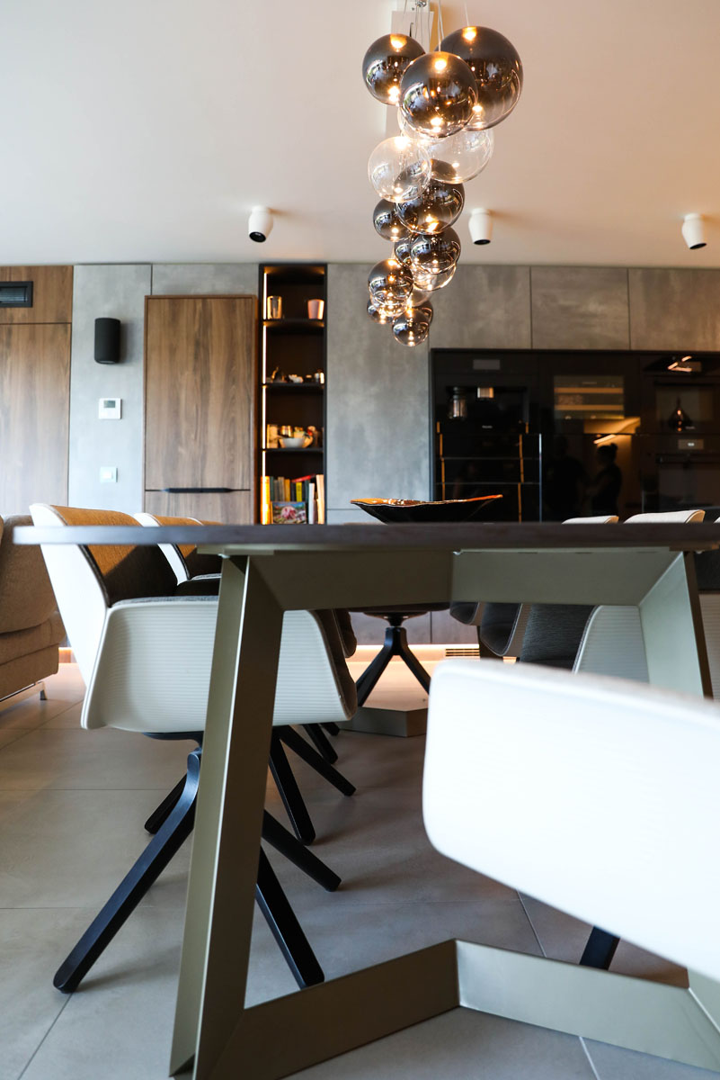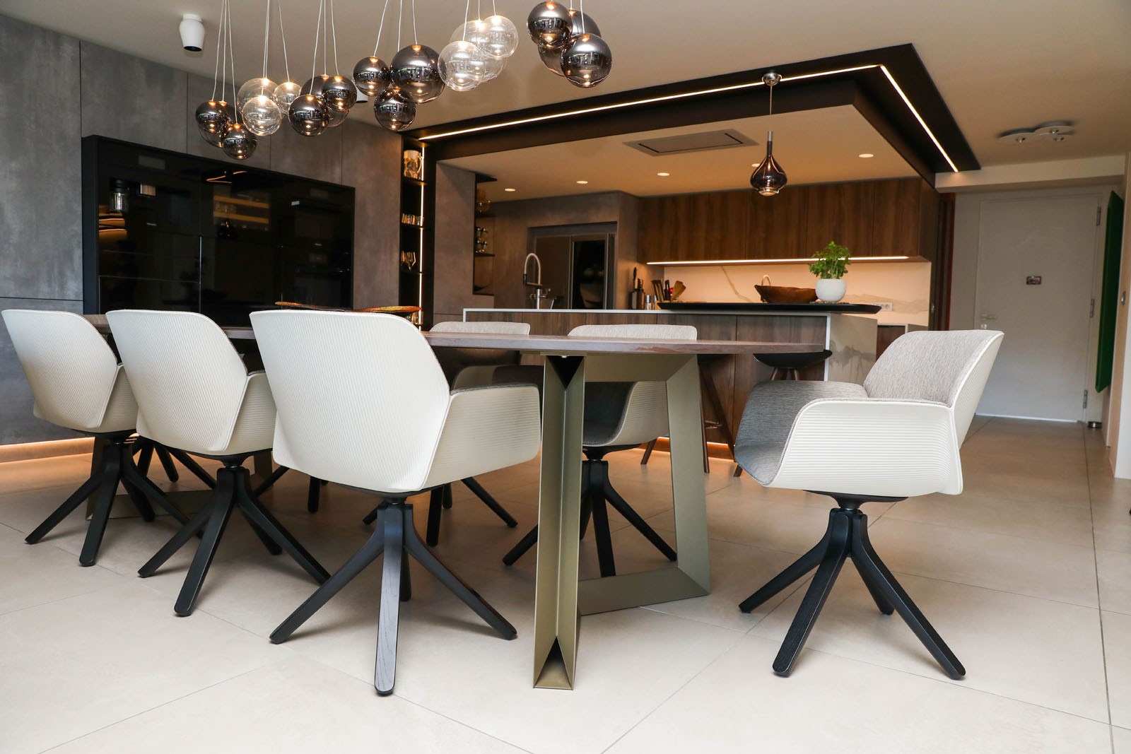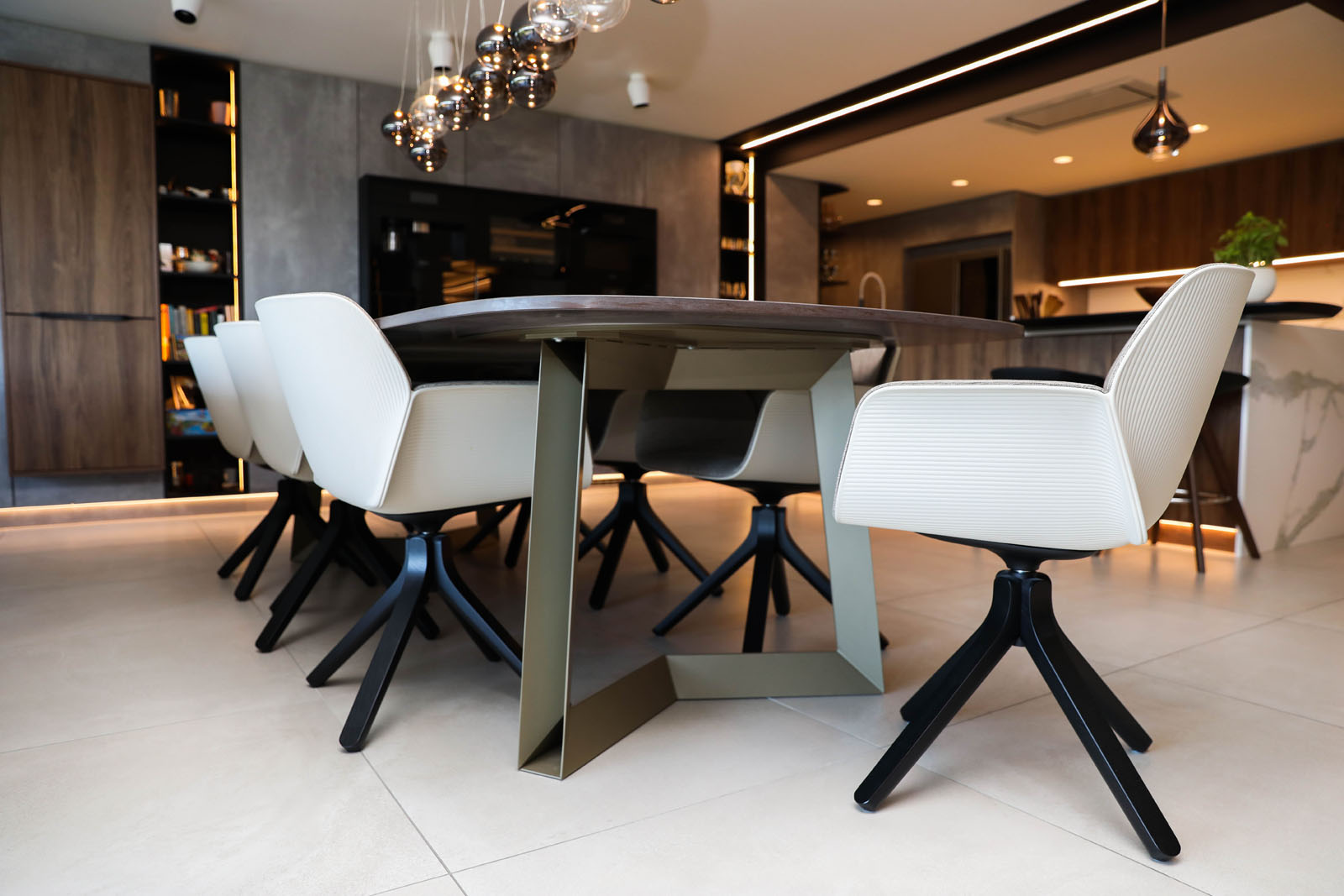 Jedilnica očara z mizo po meri, izdelano iz Dektona, s podnožjem iz prašno barvane kovine v zlati barvi. Poleg mize so postavljene vinske vitrine z LED osvetlitvijo, ki elegantno hranijo zbirko vin in kozarcev ter prostoru dodajo pridih razkošja.