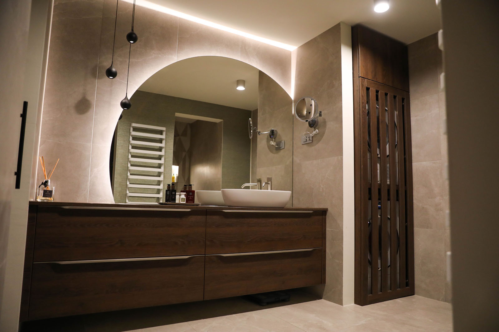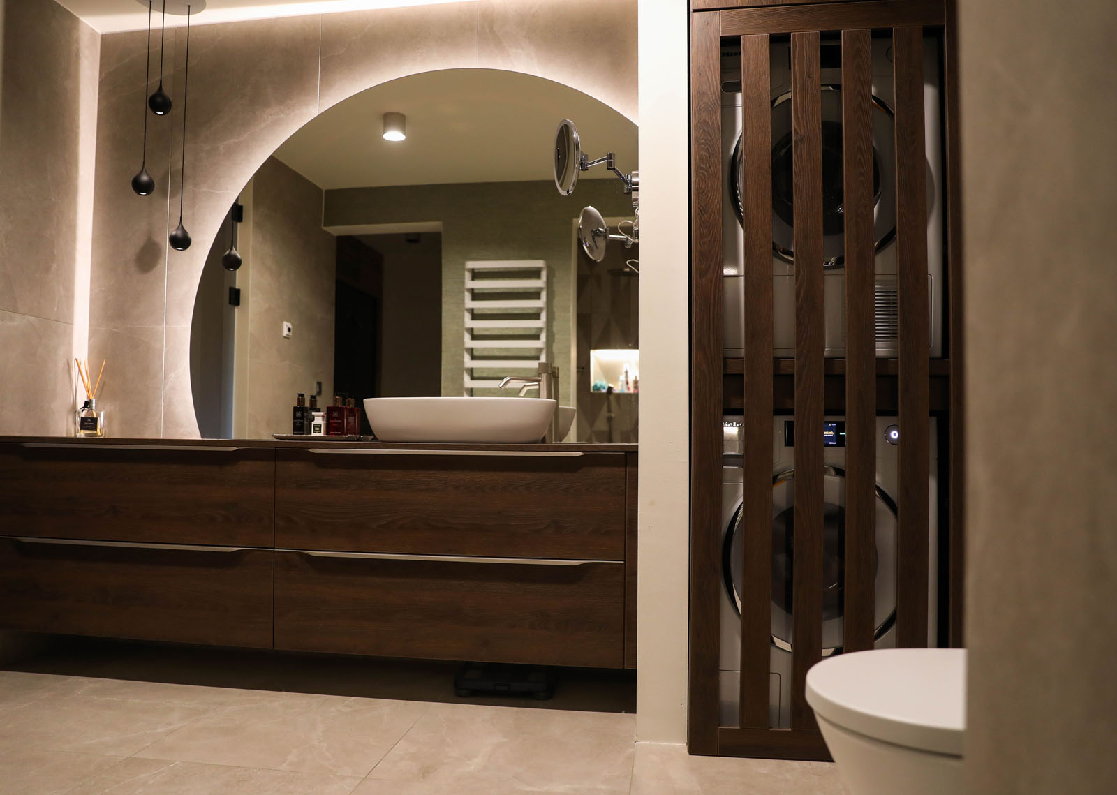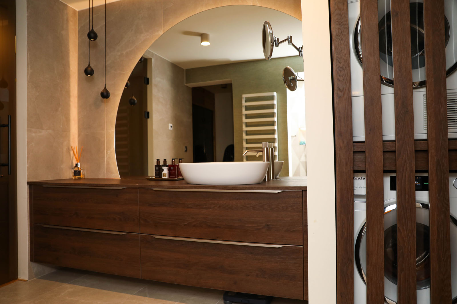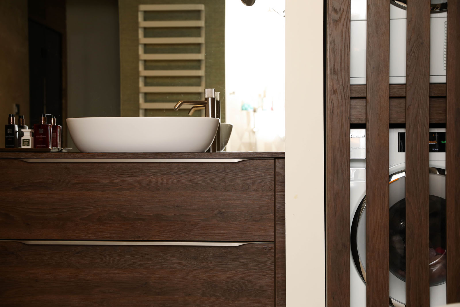 Kopalnica vključuje kopalniški element iz ultrapasa z videzom temnega lesa, veliko LED ogledalo posebne oblike ter skrito pralnico za pralni in sušilni stroj, ki sta diskretno umeščena za lesene letvice.