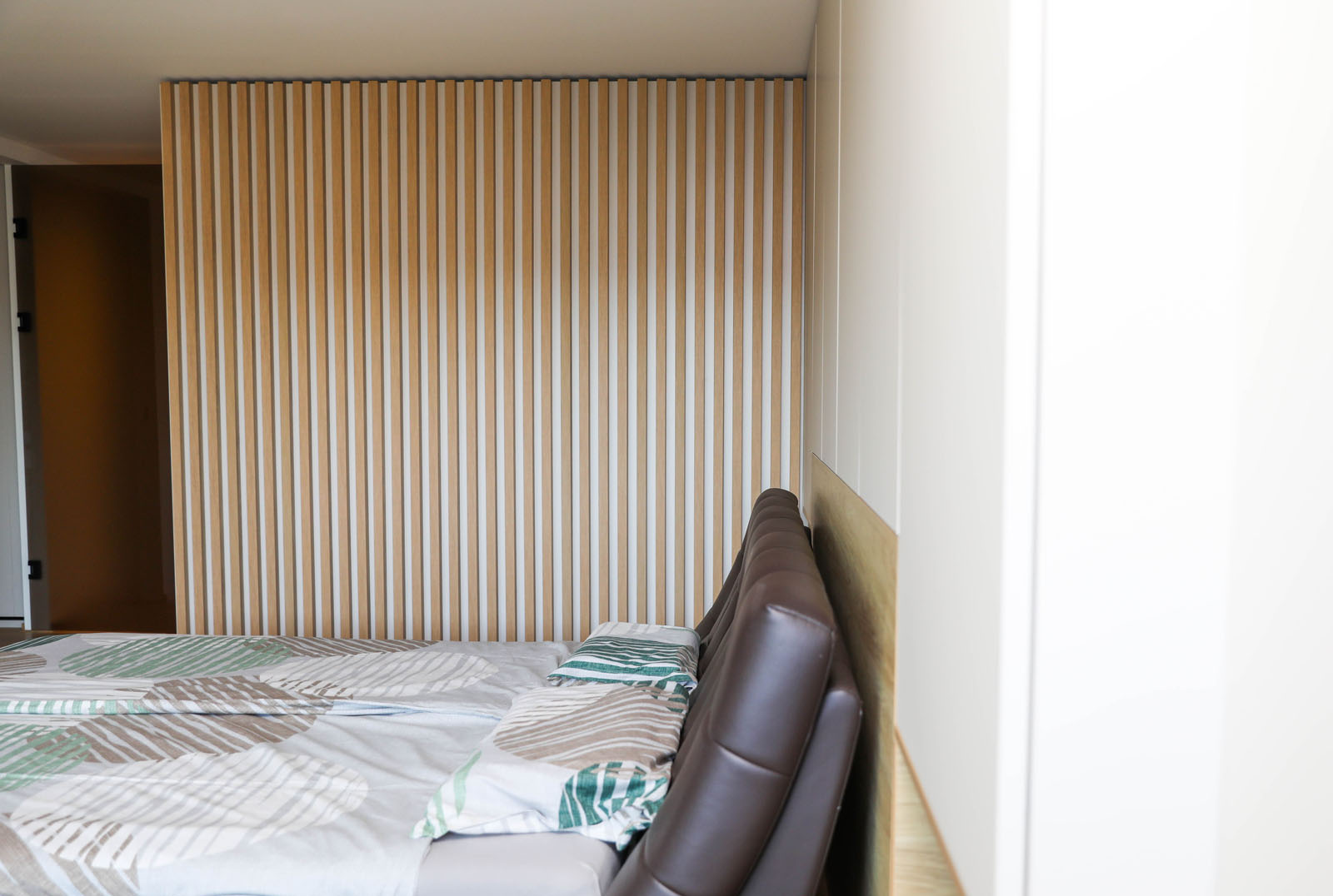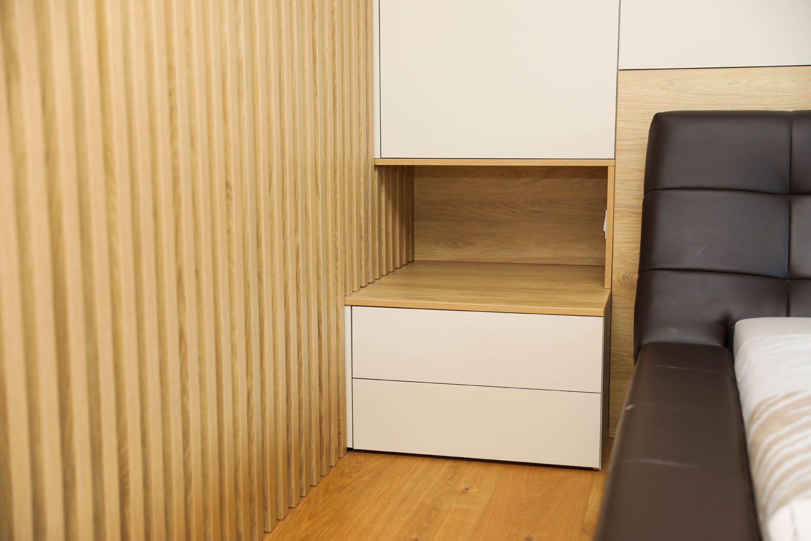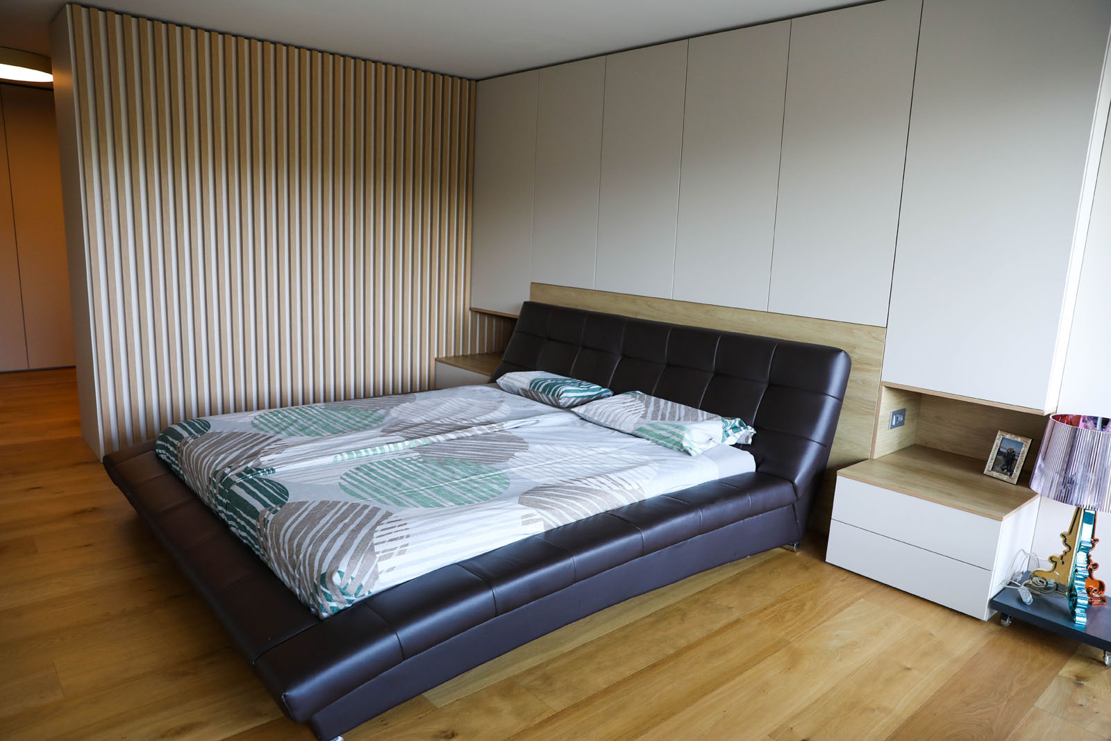 Spalnica je zasnovana z osupljivim razgledom na Dravo in Pohorje. Za posteljo se razprostira celotna stena omar po meri, ki se prepletajo z bež barvo in lesom. Na levi strani spalnice dekorativne letvice ustvarjajo mehke prehode tekstur.
