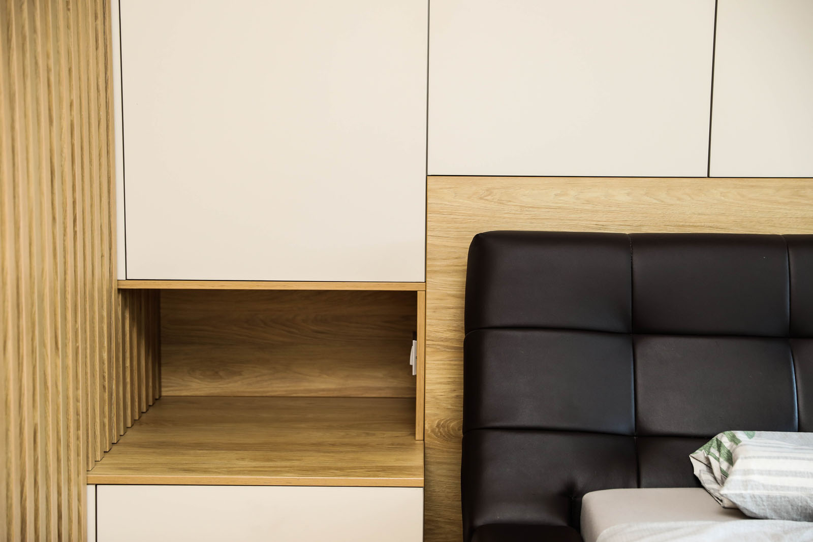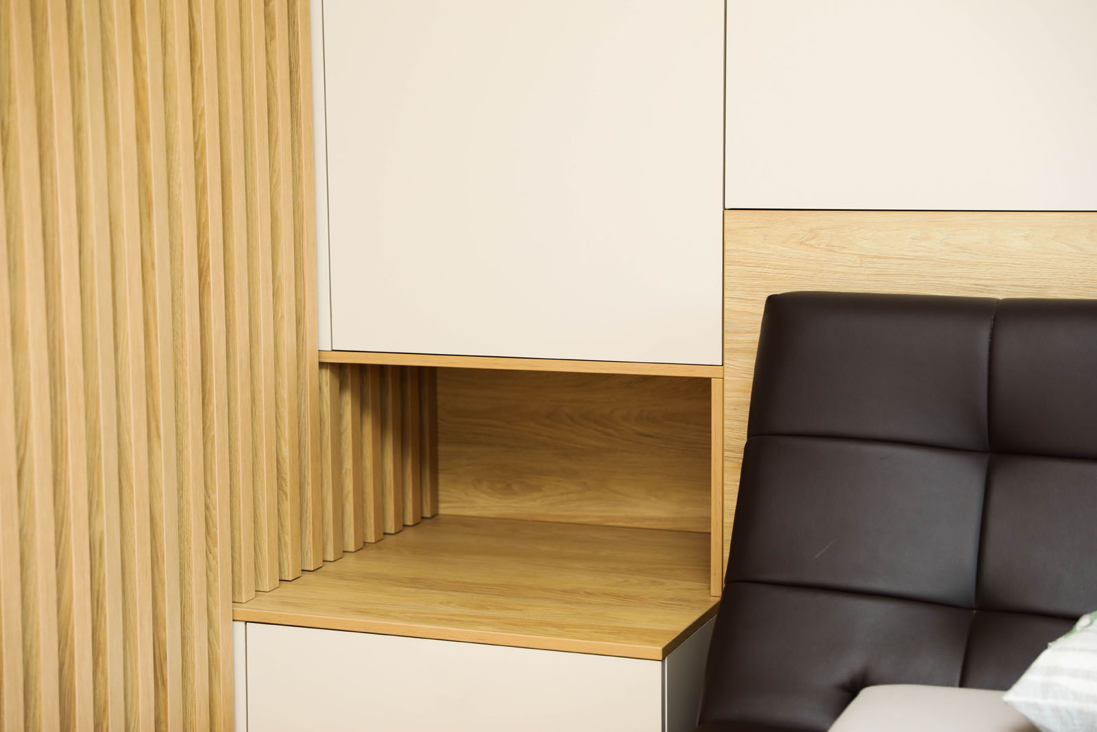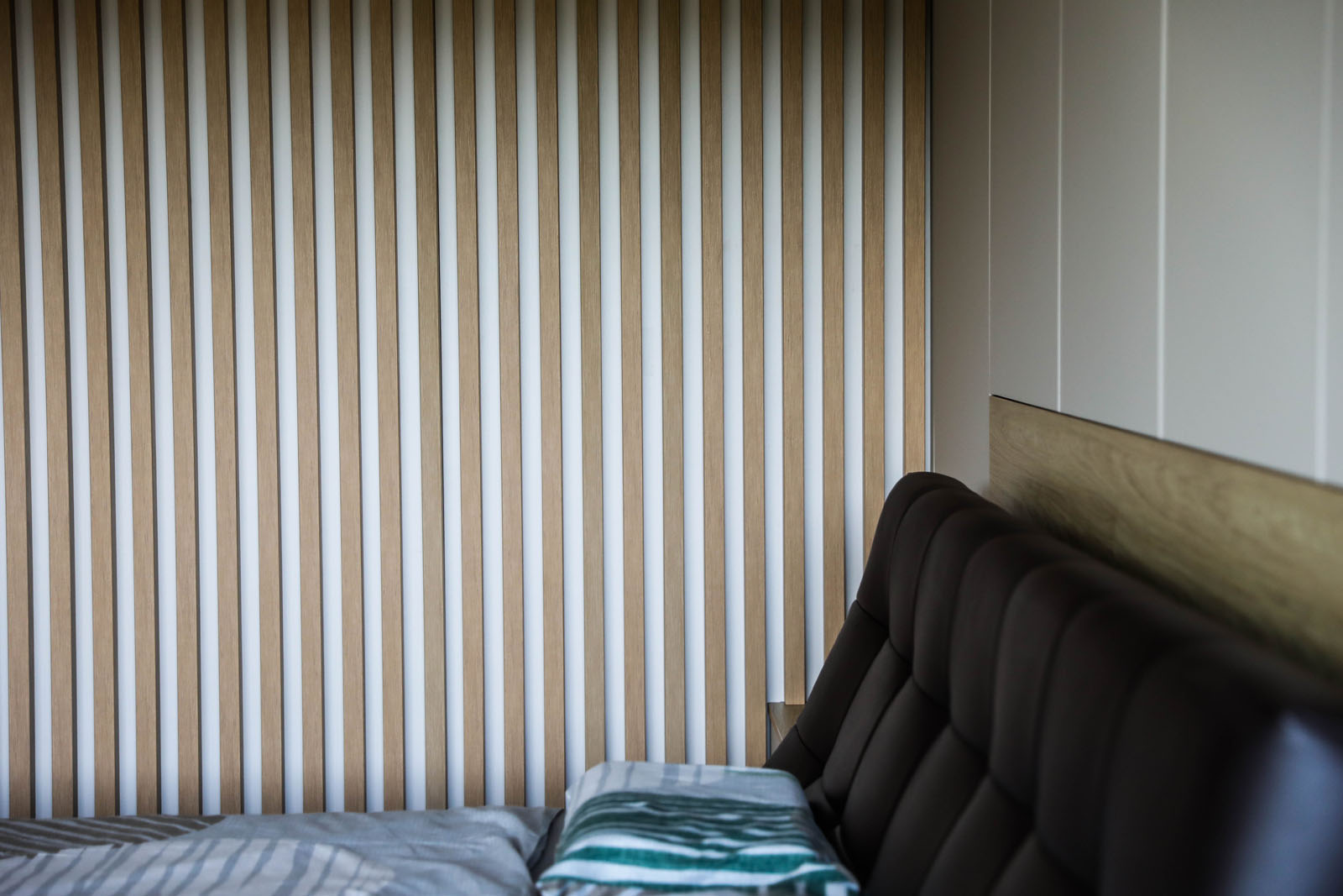 Spalnica je zasnovana z osupljivim razgledom na Dravo in Pohorje. Za posteljo se razprostira celotna stena omar po meri, ki se prepletajo z bež barvo in lesom. Na levi strani spalnice dekorativne letvice ustvarjajo mehke prehode tekstur.