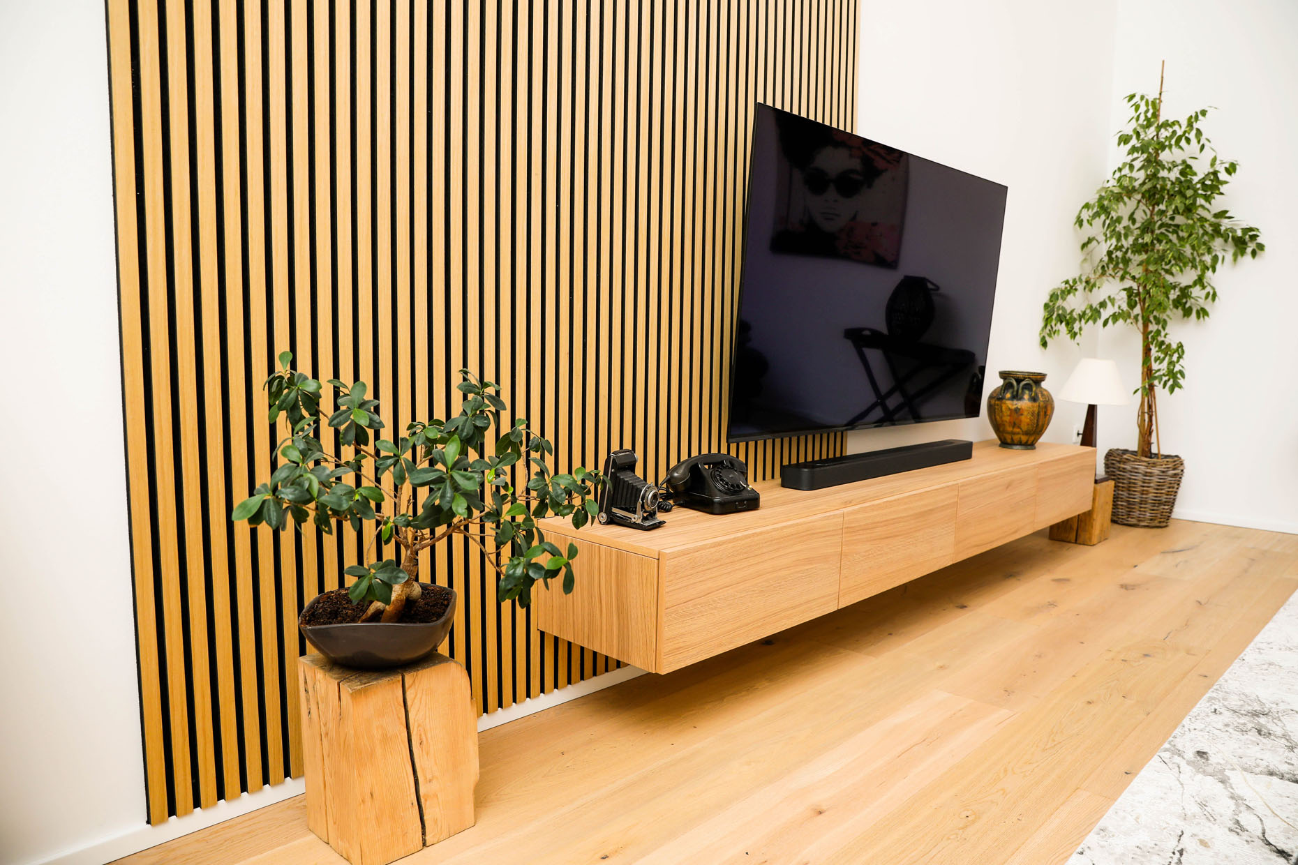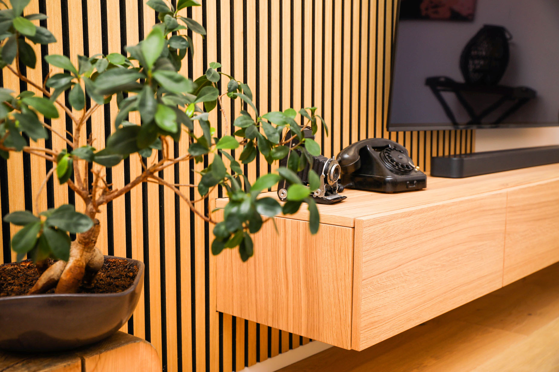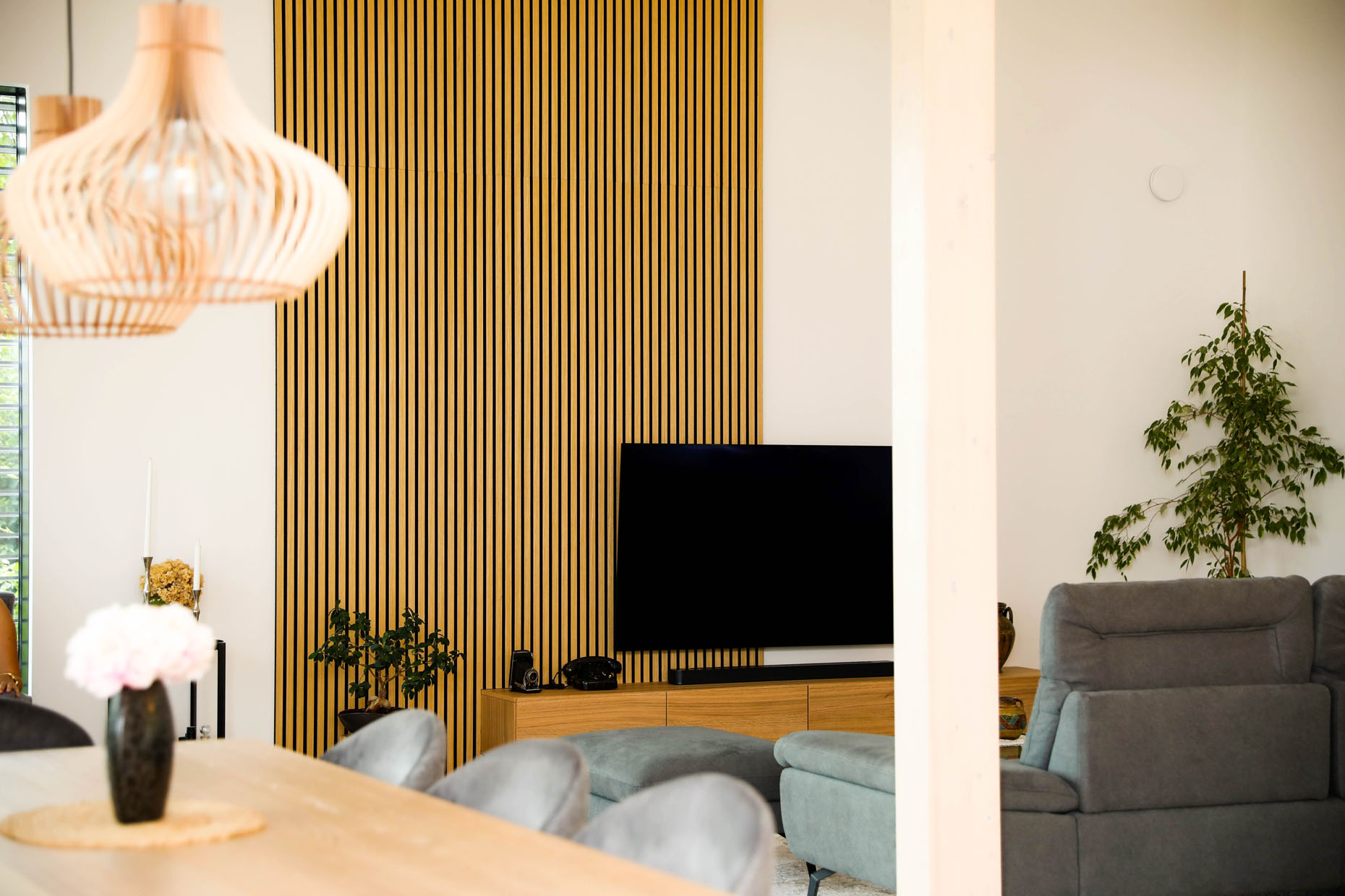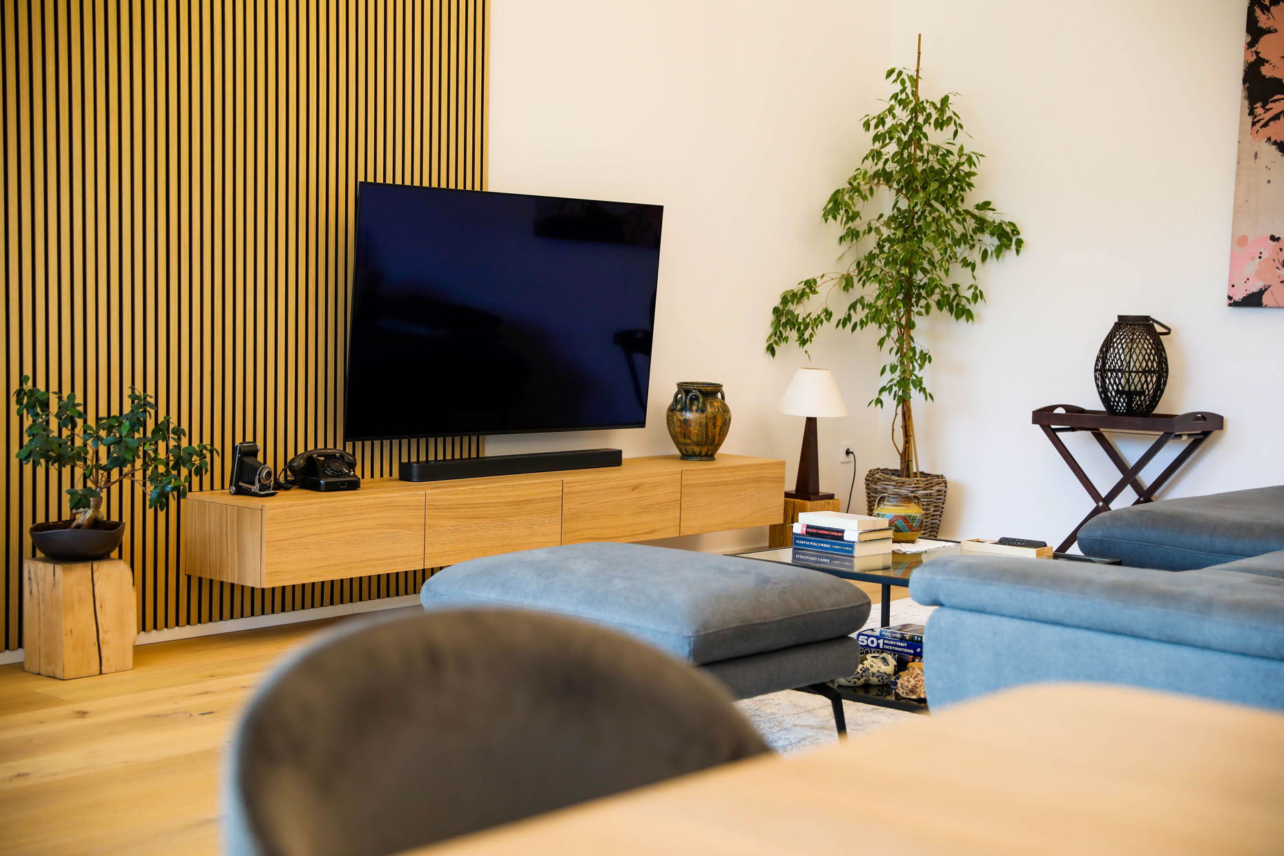 Lauden dnevna soba je zasnovana v brezčasnem minimalizmu, kjer naravni furnir poskrbi za toplino in domačnost. Največjo pozornost pritegnejo akustični paneli, ki segajo vse do štirih metrov višine in ustvarijo dih jemajoč vtis — nekaj, kar preprosto moraš doživeti v živo.