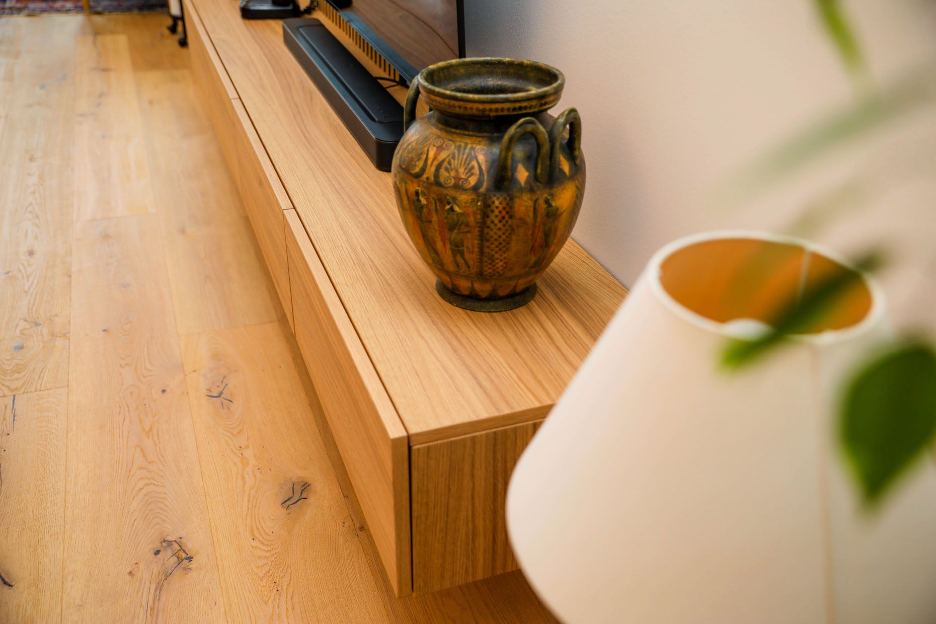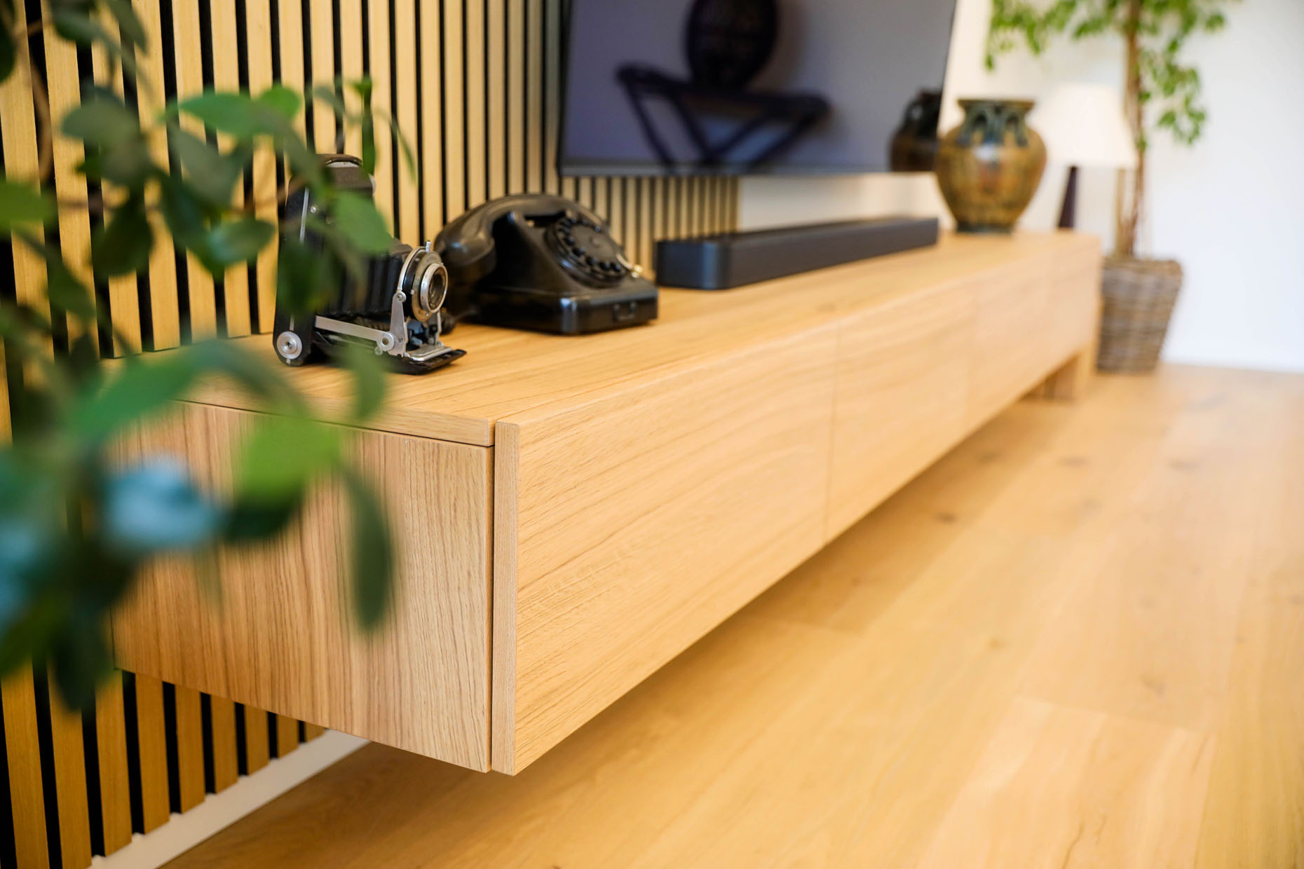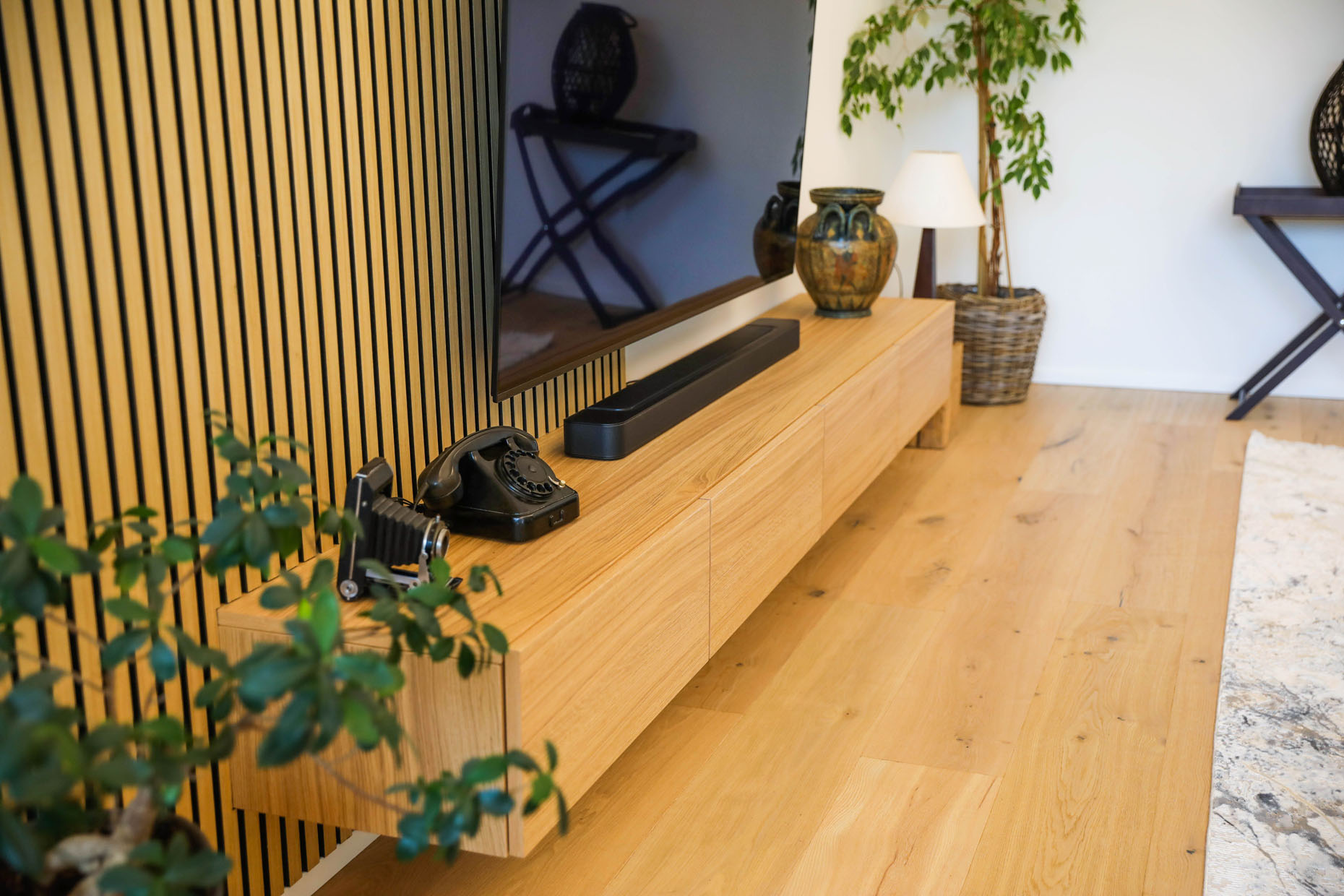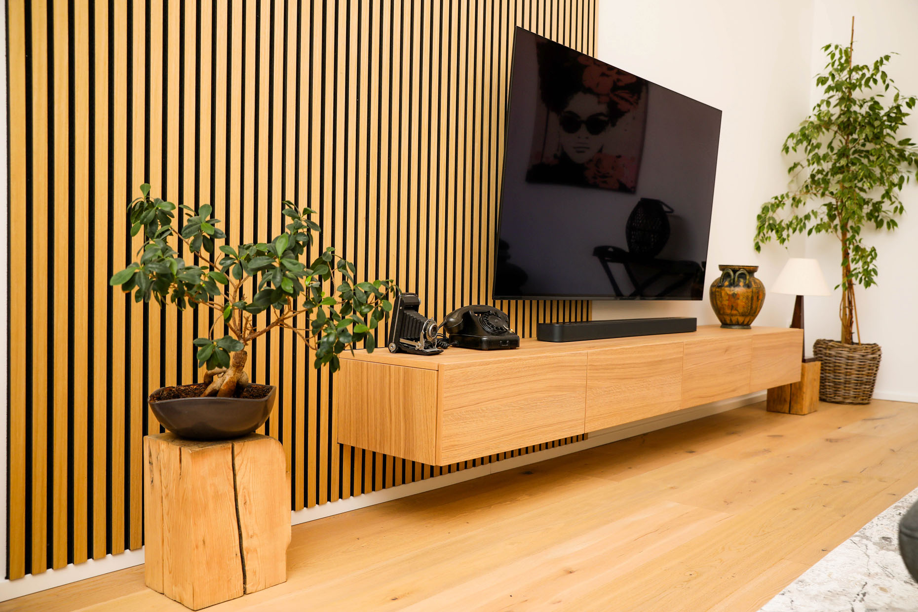 Lauden dnevna soba je zasnovana v brezčasnem minimalizmu, kjer naravni furnir poskrbi za toplino in domačnost. Največjo pozornost pritegnejo akustični paneli, ki segajo vse do štirih metrov višine in ustvarijo dih jemajoč vtis — nekaj, kar preprosto moraš doživeti v živo.