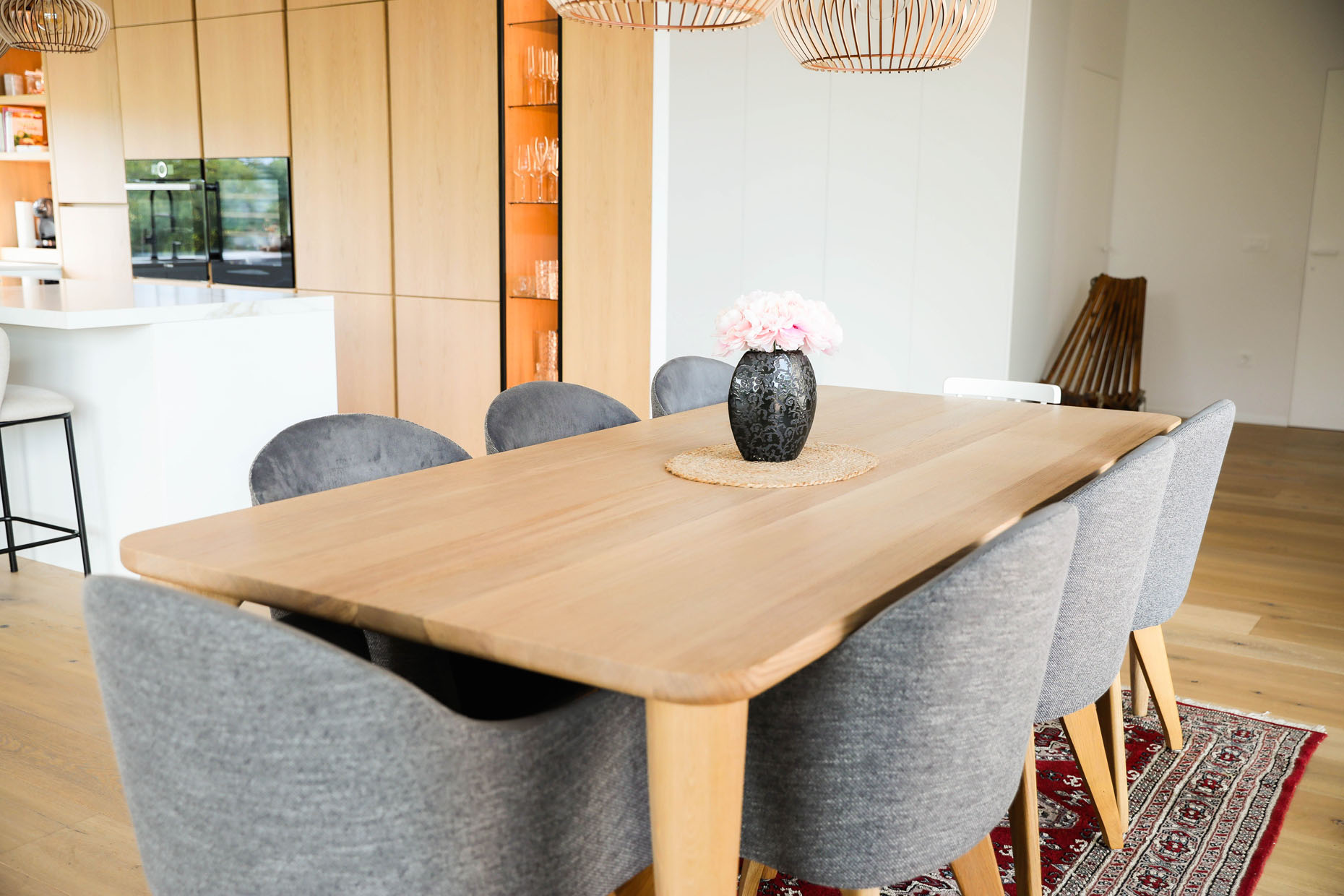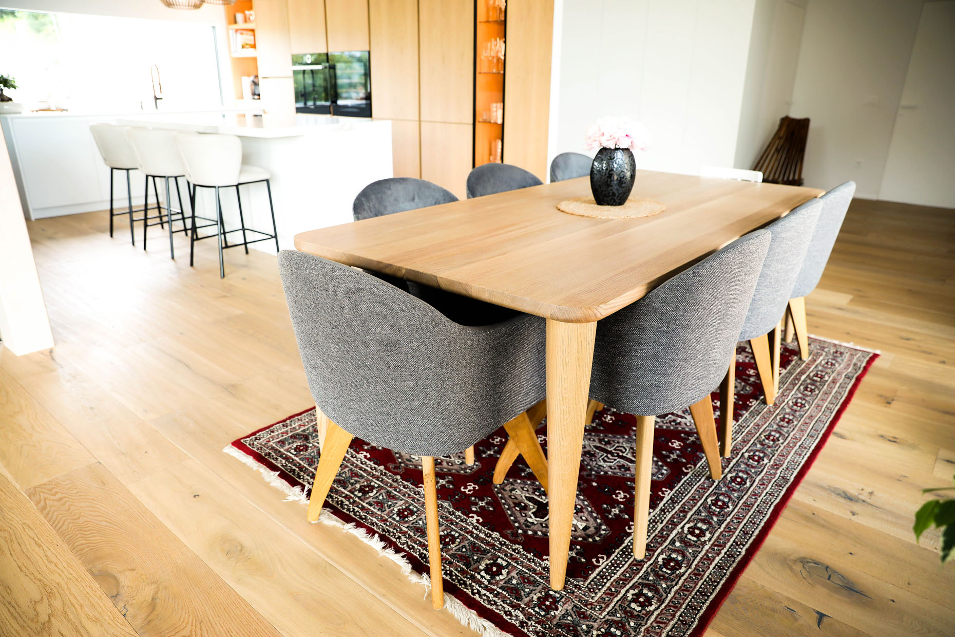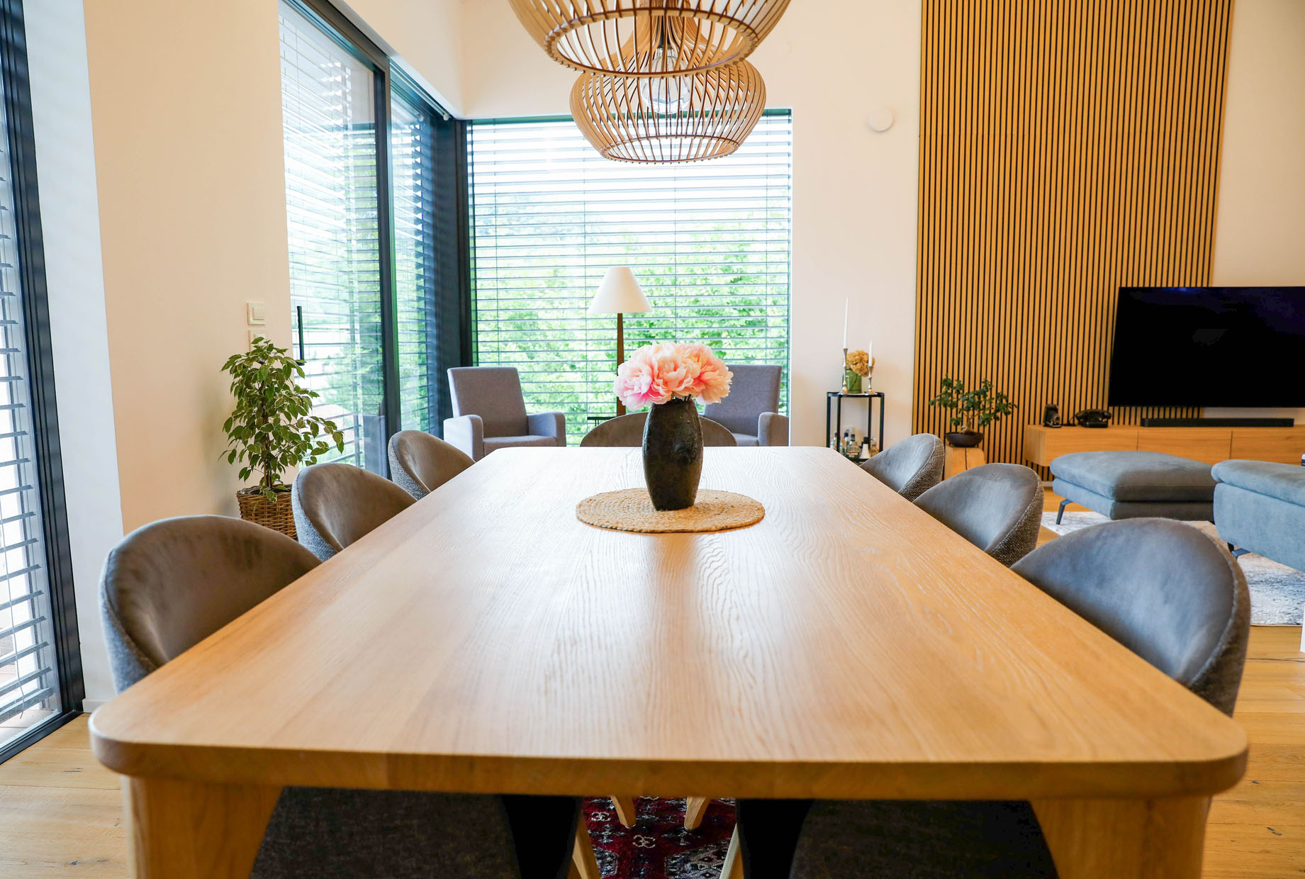 Jedilnica, kjer se čas upočasni in trenutki štejejo. Lauden masivna hrastova miza z mat lakom in izstopajočo obliko ni le kos pohištva, ampak prostor, kjer se zbirajo smeh, pogovori in dobra hrana. Posebna oblika mize prinese svežino v prostor in poveže sodobno kuhinjo z domačim utripom jedilnice, medtem ko mehki stoli ob njej vabijo, da ostaneš malo dlje in uživaš v družbi.